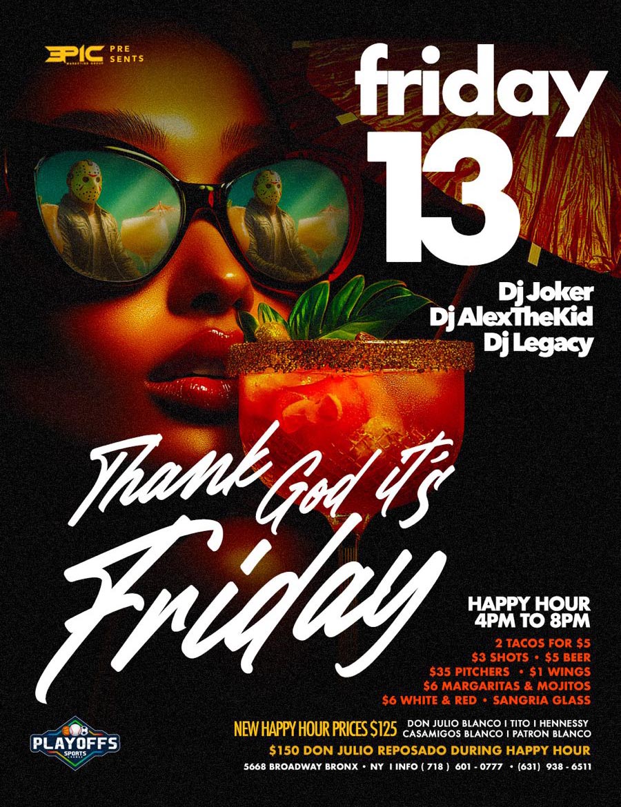 With Innovative Latin American cuisine, superb cocktails, elegant space with white banquettes, Playoffs Sports Lounge is an incredible venue with party vibes. Join us Monday to Saturday for Happy Hour, cocktails and dinner 5 pm till late and Sunday for Brunch 1 pm to 2 am. We've got you covered for all sporting events and party spaces. It's the perfect venue for parties and celebrations, Diner, Brunch, Dj, Sports; all in 1 place. Stop in with friends to experience why Playoffs has become the Destination Weekend Spot.